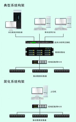 ■系統(tǒng)構(gòu)架 系統(tǒng)組成 旋轉(zhuǎn)機(jī)械振動(dòng)監(jiān)測(cè)分析系統(tǒng)主要由以下幾個(gè)部分組成: ■振動(dòng)數(shù)據(jù)采集器: 提供1路 鍵相信號(hào)、 8路 振動(dòng)信號(hào)的現(xiàn)場(chǎng)振動(dòng)數(shù)據(jù)采集; 通過(guò)1 0 M以太網(wǎng)連接構(gòu)成系統(tǒng)現(xiàn)場(chǎng)采集網(wǎng); ■數(shù)據(jù)采集站: 負(fù)責(zé)一個(gè)或多個(gè)振動(dòng)數(shù)據(jù)采集器的數(shù)據(jù)收集、處理和數(shù)據(jù)庫(kù)存貯; 一方面通過(guò)現(xiàn)場(chǎng)采集網(wǎng)收集數(shù)據(jù)采集器數(shù)據(jù), 另一方面通過(guò)以太網(wǎng)連接系統(tǒng)數(shù)據(jù)庫(kù)服務(wù)器和監(jiān)測(cè)分析站組成振動(dòng)監(jiān)測(cè)分析網(wǎng); 安裝Wi n d o ws 2 0 0 0 / X P系 統(tǒng); ■數(shù)據(jù)庫(kù)服務(wù)器: 通過(guò)My S QL數(shù) 據(jù)庫(kù)系統(tǒng)存貯和管理系統(tǒng)數(shù)據(jù); 安裝Wi n d o ws X P / S e r v e r 2 0 0 0 / 2 0 0 3系統(tǒng); 為數(shù)據(jù)采集站、 監(jiān)測(cè)分析站等提供數(shù)據(jù)庫(kù)訪問(wèn)和網(wǎng)絡(luò)通信服務(wù); ■監(jiān)測(cè)分析站: 允許振動(dòng)監(jiān)測(cè)、 分析及故障診斷軟件; 安裝Wi n d o ws 2 0 0 0 / X P系統(tǒng); |  |